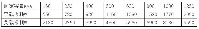 干式變壓器技術(shù)參數(shù)有:①頻率50Hz,②空載電琉,要求少于4%,③低壓耐壓強度:2KV/min無擊穿,④絕緣電阻低壓側(cè)不少于2MΩ,⑤繞組連接方式:/Y/yn0,與D/yn0 ,⑥線圈允許溫升100K,⑦散熱方式:自然風冷或溫控風冷,⑧噪聲系數(shù)小于30dB。各種容量干式變壓器(SCB型)損耗參數(shù)如表1所示。