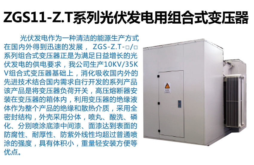 ZGS-Z.T-□/□系列組合式變壓器是消化吸收內(nèi)外的先進(jìn)技術(shù)結(jié)合內(nèi)需求自行開發(fā)的系列產(chǎn)品,該產(chǎn)品是將變壓器,負(fù)荷開關(guān),高壓熔斷器安裝在變壓器的箱體內(nèi),利用變壓器的絕緣液體作為整個(gè)產(chǎn)品的絕緣和散熱介質(zhì),采用全密封結(jié)構(gòu),外殼采用分體,噴丸、酸洗、磷化、分別噴涂底漆、中間漆、面漆達(dá)到表面的防腐性、耐厚性、防紫外線性均超過普通噴涂的強(qiáng)度,具有體積小,重量輕、安裝方便等優(yōu)點(diǎn)。